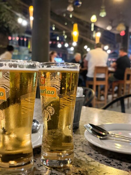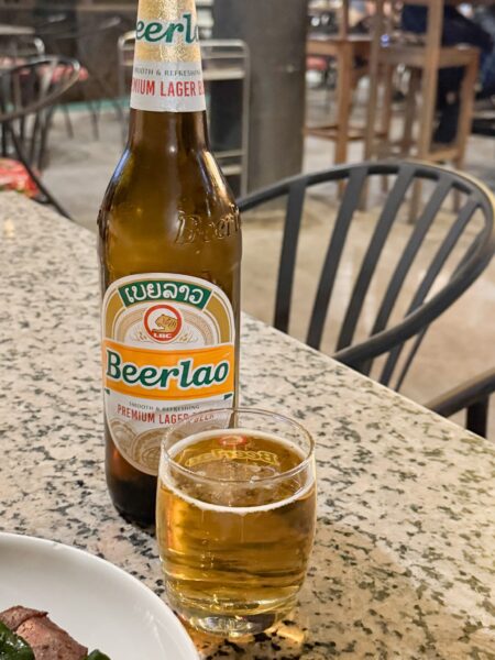 ビエンチャンには夜の到着だったので、ホテルにチェックインしてすぐ、近所の評判よさそうなレストランへと繰り出しました。なにはともあれ、ビアラオで乾杯〜!