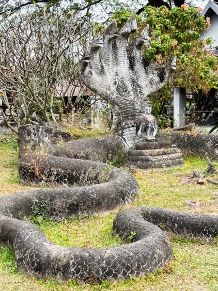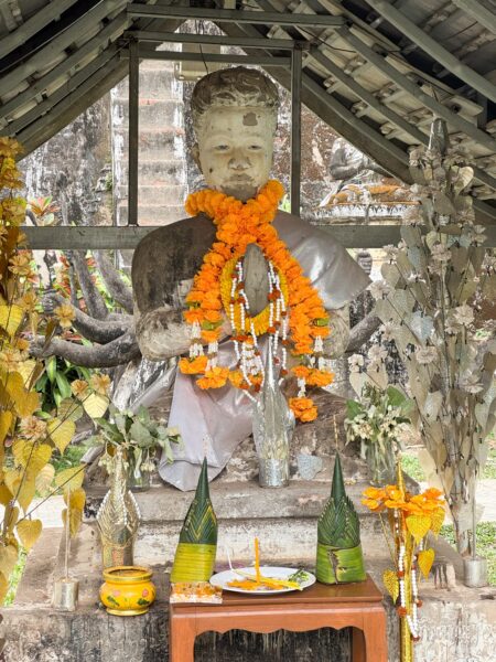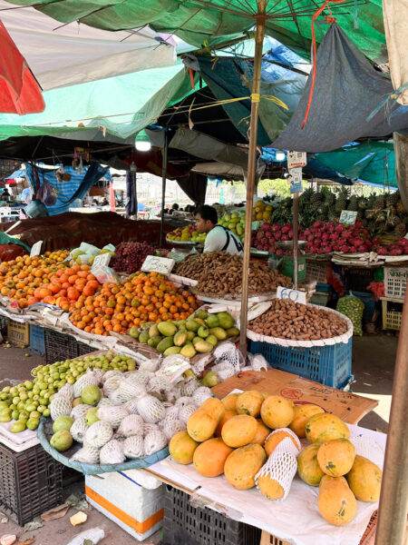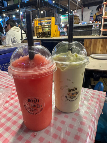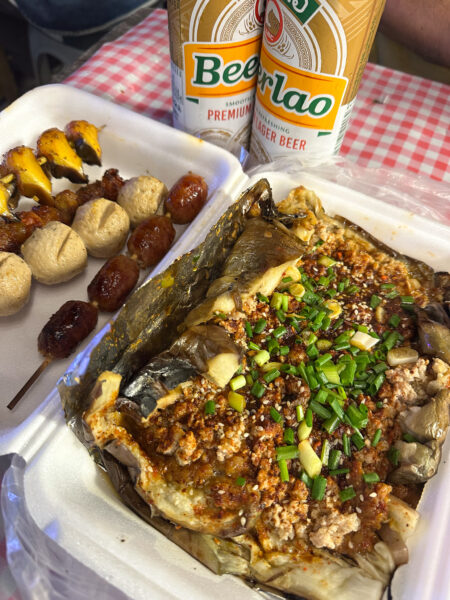 翌日は、ホテルからぶらぶら歩いて観光に。織物博物館、よかったんだけど、写真不可のため記録なし。そして、昨日連れていってもらったお店で、ヴィエンチャンでどうしても食べたかったカオチーパテ(このお店はベトナム料理店なのでバインミーだね)と、アボカドジュースでランチ。いやいや美味しいですね〜。その後、もはや観光地と化しているショッピングモール「タラートサオ」に行き、近所のローカル市場にも潜入。こっちのほうが人々の暮らしが垣間見れて楽しい。近場をあちこち見てまわり、夕食は地元の人で賑わうナイトマーケットで。座るところがなくて困っていたら、屋台のおっちゃんがここに座れ、と席を用意してくれました。やさしいねぇ、ありがとう!