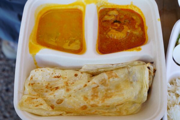 ダルとチキンのカレーをつけて、ウマウマ〜!